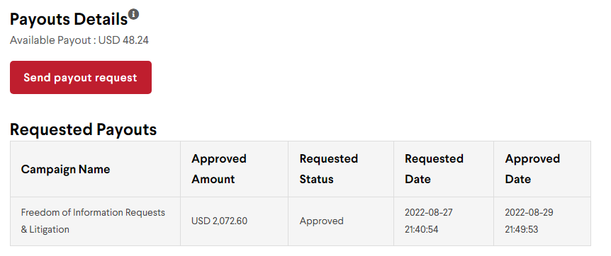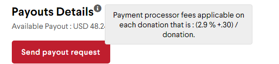 So far, the campaign has raised $2195. I took a payout request with 1-2 donations coming in after the request, and it was processed for $2072.60.