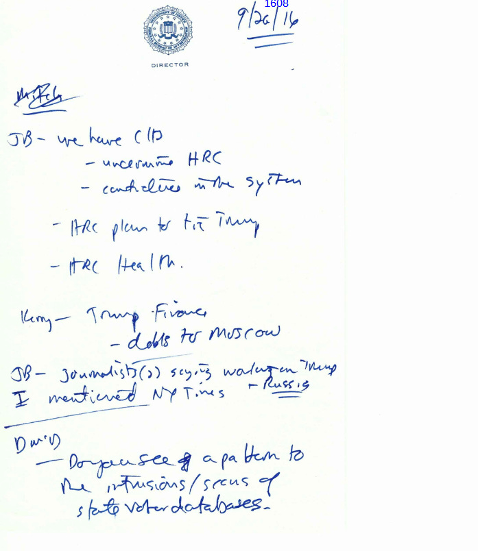 Exhibit 13 - Comey’s handwritten notes. There is a reference to Clinton’s plan to tie Trump to Russia, which had just been referred to the FBI by the CIA.